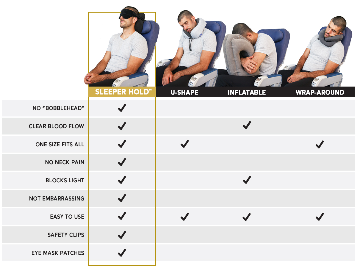 Unlike other travel pillows that failingly try to solve "bobblehead" by putting pressure on your neck/jaw, the Sleeper Hold's patented design securely attaches to the seat-back or headrest to gently support your head while blocking out the light.